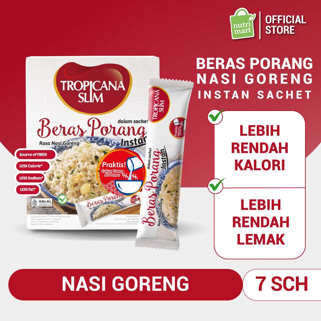 Tropicana Slim Beras porang instan rasa nasi goreng nikmat, praktis dalam sachet, tinggal diseduh air panas, dengan serat lebih tinggi, cocok untuk diabetes dan diet.