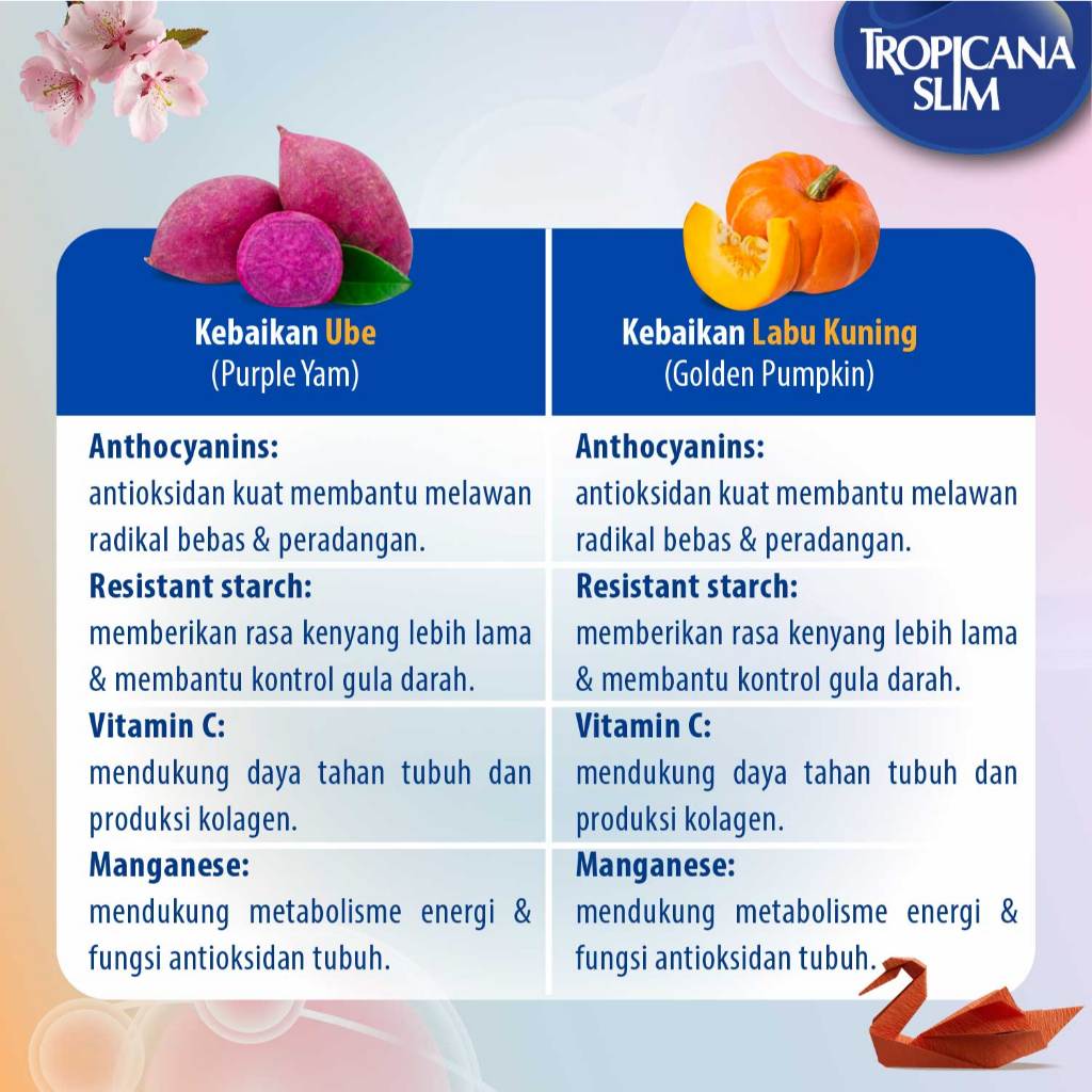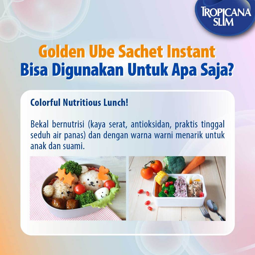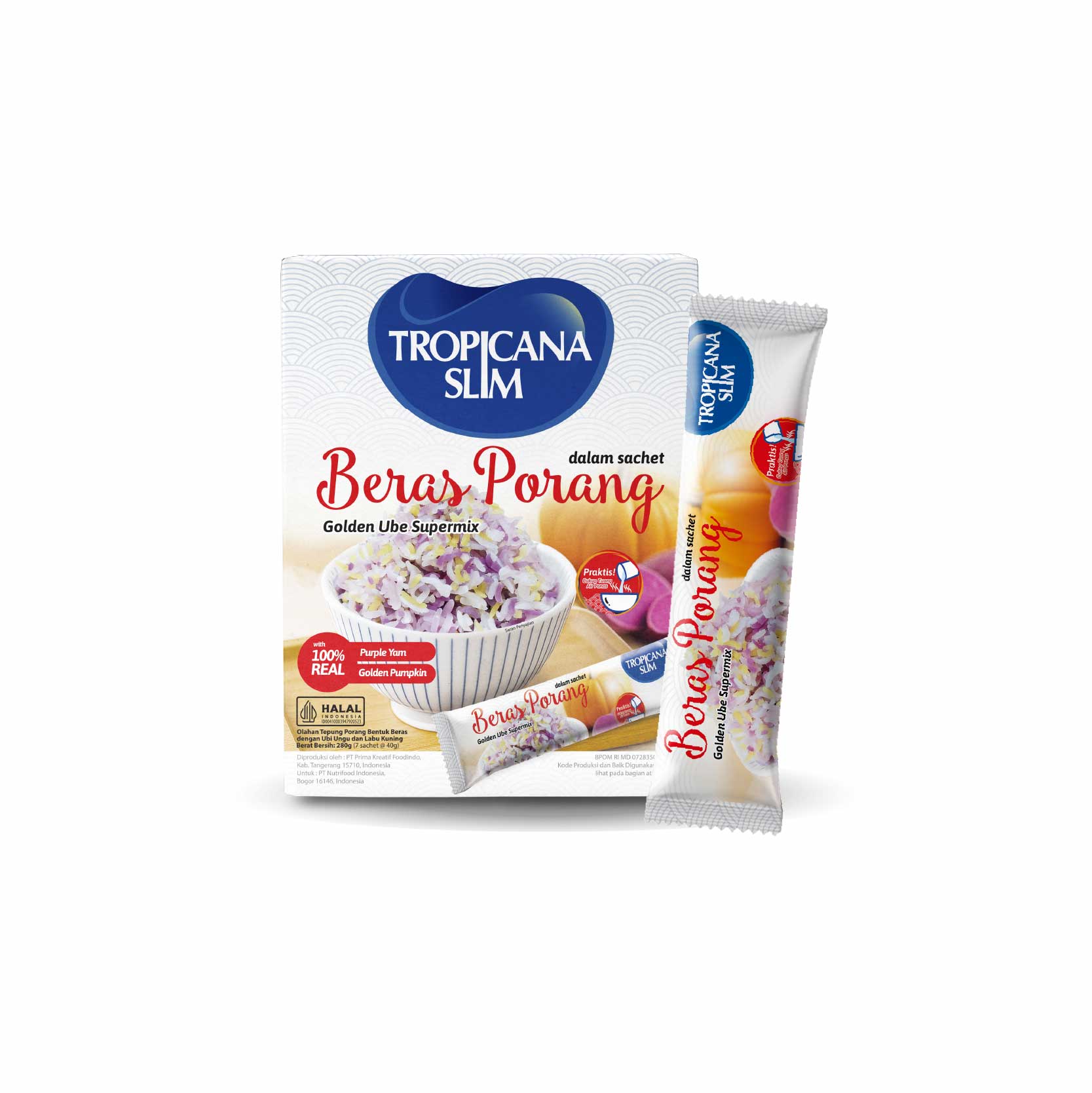 Tropicana Slim Beras porang Instan Golden Ube Supermix, dalam kemasan sachet yang praktis, tinggal diseduh air panas, dengan kebaikan ubi ungu dan labu kuning, nikmat dan pulen dengan serat lebih tinggi, cocok untuk diabetes dan diet.