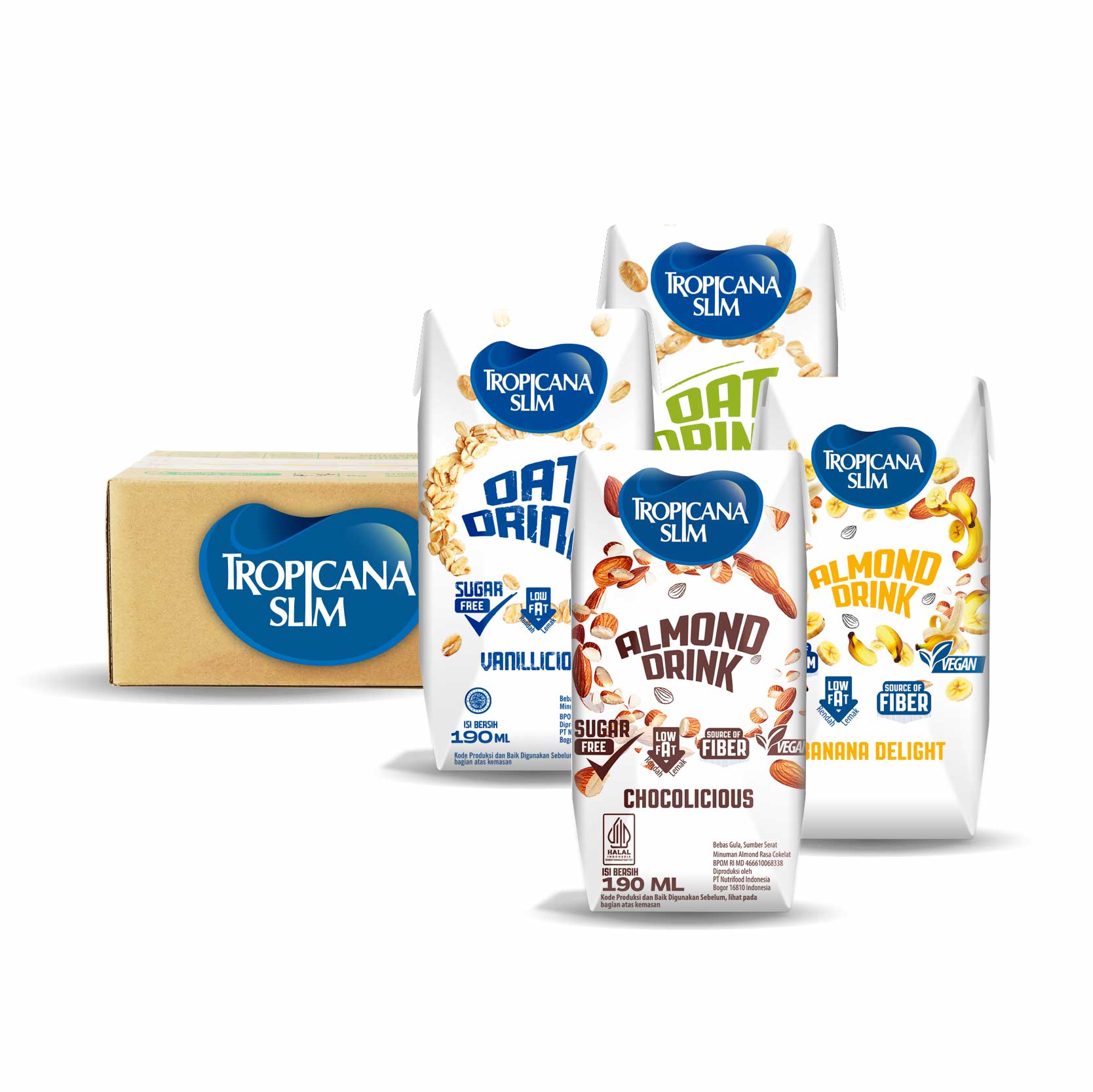 Tropicana Slim Plant Based Drink adalah minuman yang berasal dari oat atau almond yang bebas gula, rendah lemak, dan merupakan sumber serat dan kalsium dengan 4 pilihan varian yang nikmat sehingga cocok untuk diet dan aman untuk diabetesi.